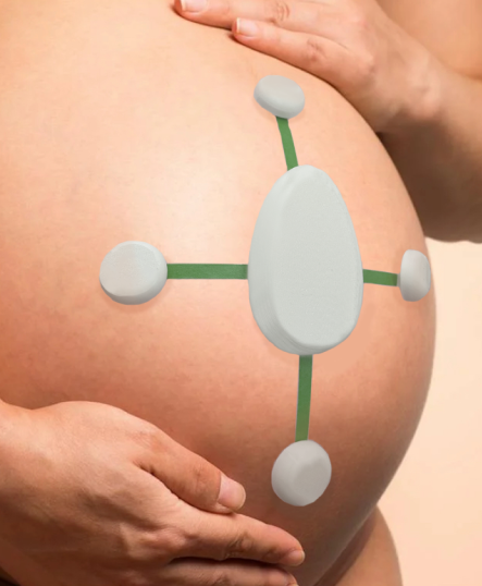As part of my Engineering Capstone, my group and I designed a non-invasive Transabdominal Pulse Oximeter for sensing oxygen saturation levels in a fetus during labor. We sought to create an alternative monitoring system to current Electronic Fetal Monitoring (EFM) which relies on fetal heart rate – a less predictive measure for fetal complications than direct monitoring of oxygen levels. The device would stretch across the abdomen as pictured and like current pulse oximetry technology use a mix of LEDs and photodiodes (light sensors) to send light to reflect off abdominal and fetal tissue and get a mixed maternal-fetal signal of oxygen saturation. Using signal processing, the fetal signal can be isolated to get a diagnostic metric of fetal oxygen saturation.